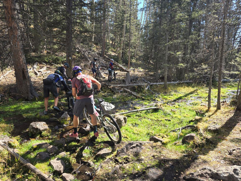 After a day spent predominantly on dirt roads, it’s back to singletrack for day 5. One of the things I like the most about the Aquarius Trail route is its diversity. The fifth day feels almost like home in the Rockies. It takes you along a section of the Great Western Trail over high-alpine, forested singletrack. We received mixed signals about what to expect this day, so let me give you my perspective. Once on the singletrack, which starts just down the road from the Aquarius Hut, you ride through some open meadows but quickly into more technical terrain. The first section has a rocky descent that requires you to dismount, as well as numerous creek crossings to navigate.