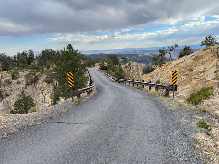 Eventually you come to a trail crossing and onto a dirt road. This is a bailout route down to Escalante and where we parted with some of our group who needed to be home a day early. The rest of us rode another 4.5 miles of primo alpine singletrack with one more massive (0.5 mile?) hike. Cross over the west branch of Pine Creek where the singletrack ends at FR-145. A day on the Aquarius Trail wouldn’t be complete without a challenge, and this day dishes it out in the form of Hell’s Backbone Road (FR-153). You’ll gain almost 1,200 feet in just over five miles. On the other side you have a descent down to the last hut, with a spectacular viewpoint at Hell’s Backbone Bridge, which spans a precarious section of rock.