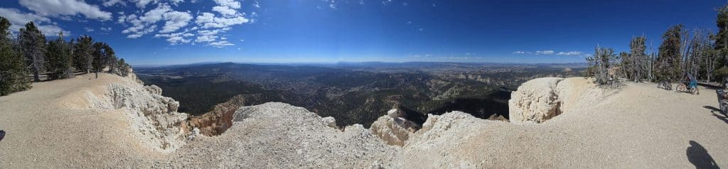 As the legs start feeling the cumulative fatigue, you have another big day. From the hut, climb 1,600 feet, bringing you to over 10,000 feet above sea level. From the top of the climb you come to the turnoff for Powell Point. This add-on is mostly a fast traverse with a couple hundred feet of ups and downs. The last bit up to the overlook is a steep five-minute grind up singletrack, but you are rewarded with fantastic views. You can see the butte you climbed past coming out of Casto Canyon as well as the Escalante River valley.
